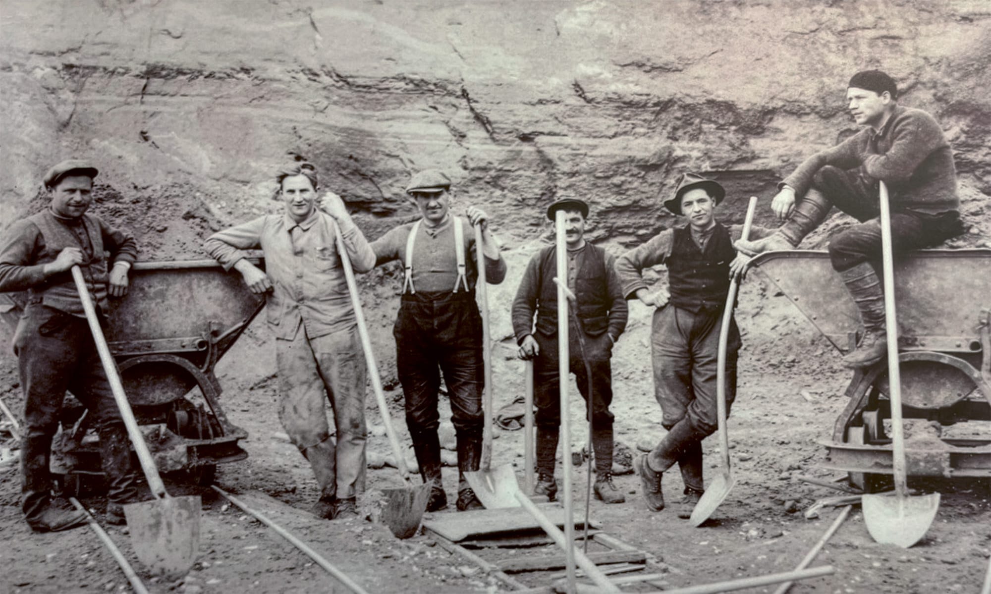 Bergwerksarbeit. Die ergiebigsten Sande lagerten tief unter anderen Schichten. Sie wurden noch in der Zwischenkriegszeit im beschwerlichen Stollenvortrieb abgebaut.